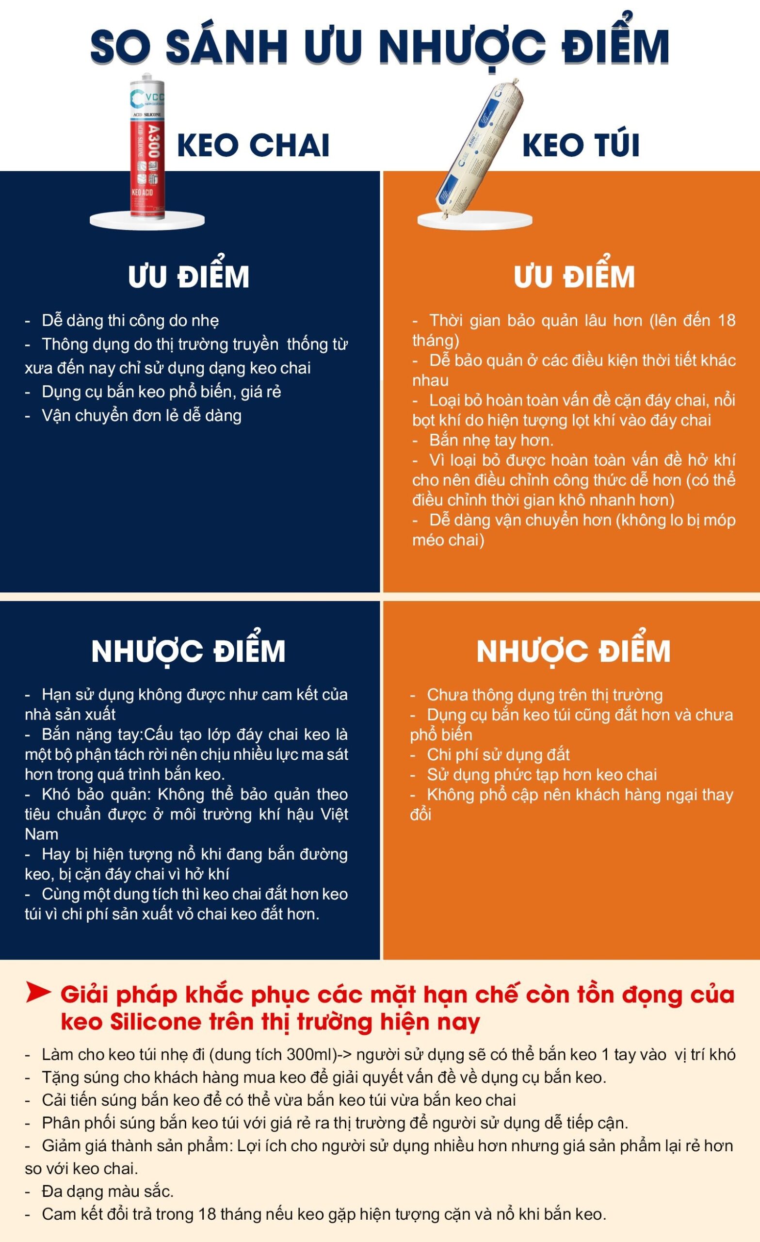 Chính vì thấu hiểu được những khó khăn của việc bảo quản sản phẩm trong điều kiện thời tiết và môi trường khắc nhiệt của việt nam. Ban lãnh đạo công ty cổ phần đầu tư và thương mại quốc tế VCC quyết tâm đi đầu thị trường keo silicone tại việt nam để đưa ra sản phẩm keo túi ( xúc xích) A500 và A600 với đa đạng về màu sắc như keo đóng chai truyền thống. Dòng sản phẩm này sẽ giải quyết toàn bộ các vấn đề mà keo chai gặp phải cũng như giải quyết được cơ bản các nhược điểm của keo túi 600ml nêu ở trên. Giải pháp của VCC đưa ra là: